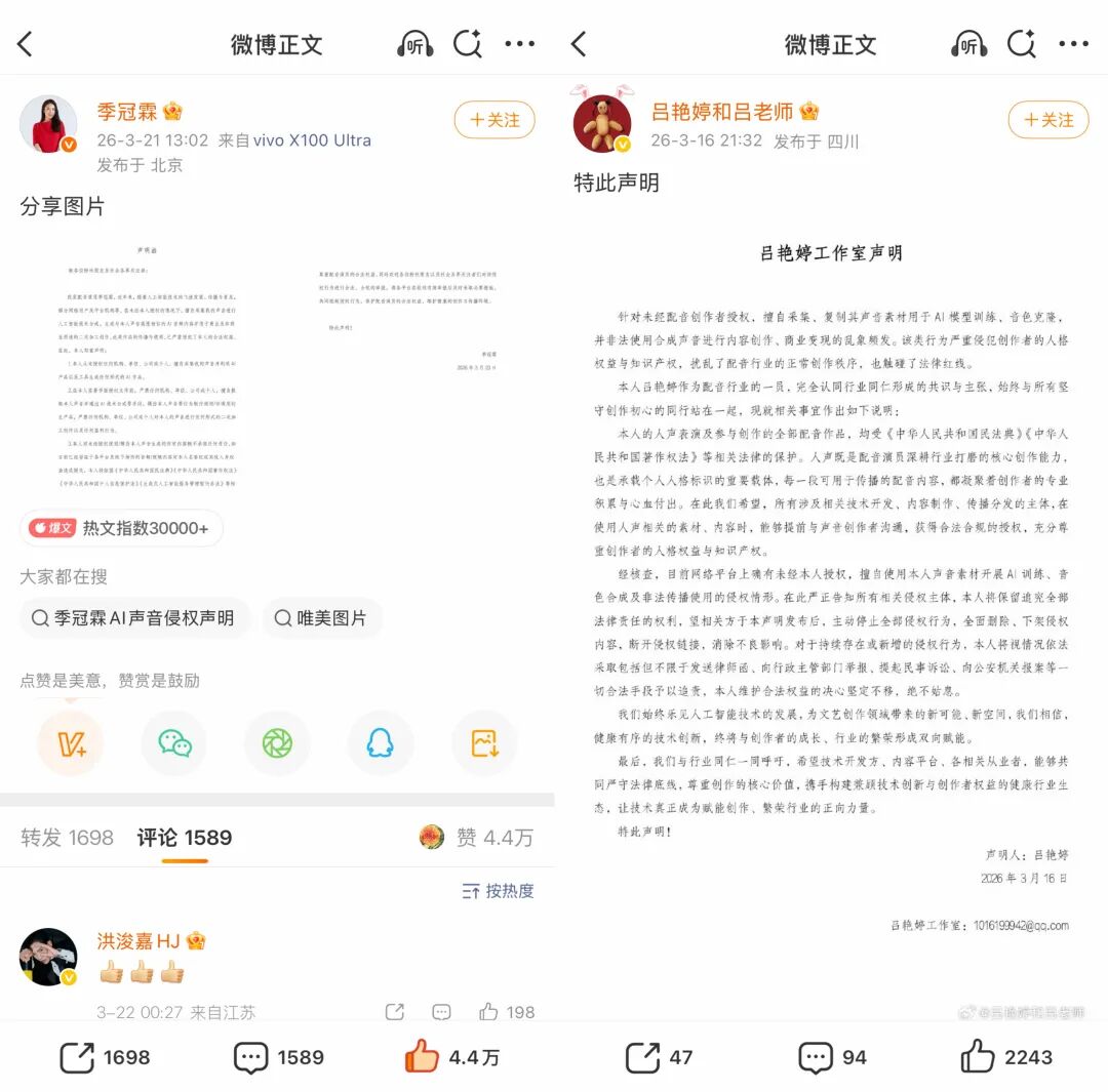 《甄嬛传》的配音演员季冠霖、《哪吒》的配音演员吕艳婷等人也相继发声明,直指未经授权的声音克隆与滥用行为。
