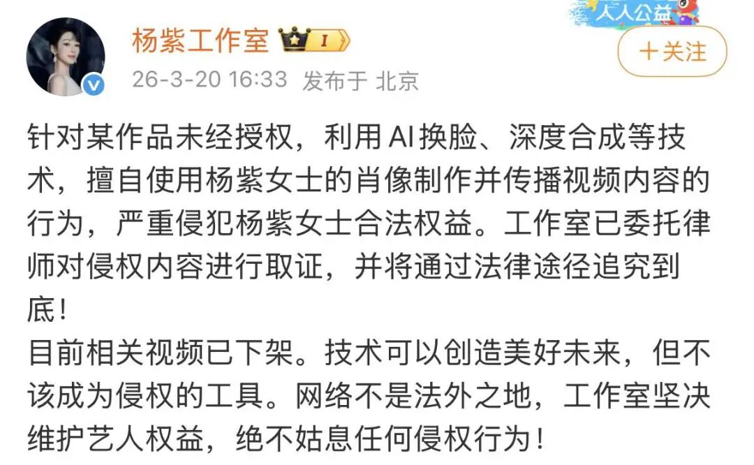 杨紫工作室随即发文,表示工作室已委托律师对侵权内容进行取证,并将通过法律途径追究到底。目前相关视频已下架。