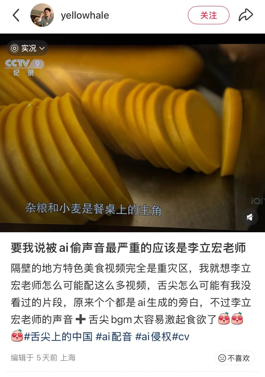 在社交媒体,也有不少网友讨论发现一些AI漫剧的配音酷似某些知名配音演员,就连《舌尖上的中国》旁白配音演员李立宏的声音,也经常被“盗用”在各类美食视频中,足见当下AI配音侵权行为的泛滥程度。