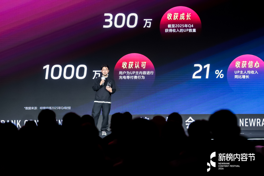 截至2025年Q4,获得收入的UP主数量为300万;1000万用户为UP主内容进行了充电等付费行为,同时,UP主人均收入同比增长了21%。