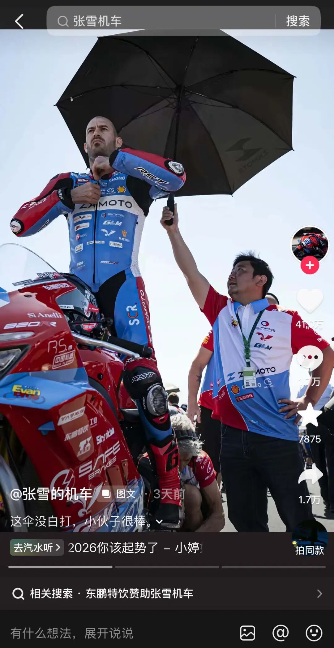 此前,张雪因征战WSBK在抖音发视频寻找赞助商,当时不少网友纷纷去东鹏特饮官方账号下评论“牵红线”促成合作。