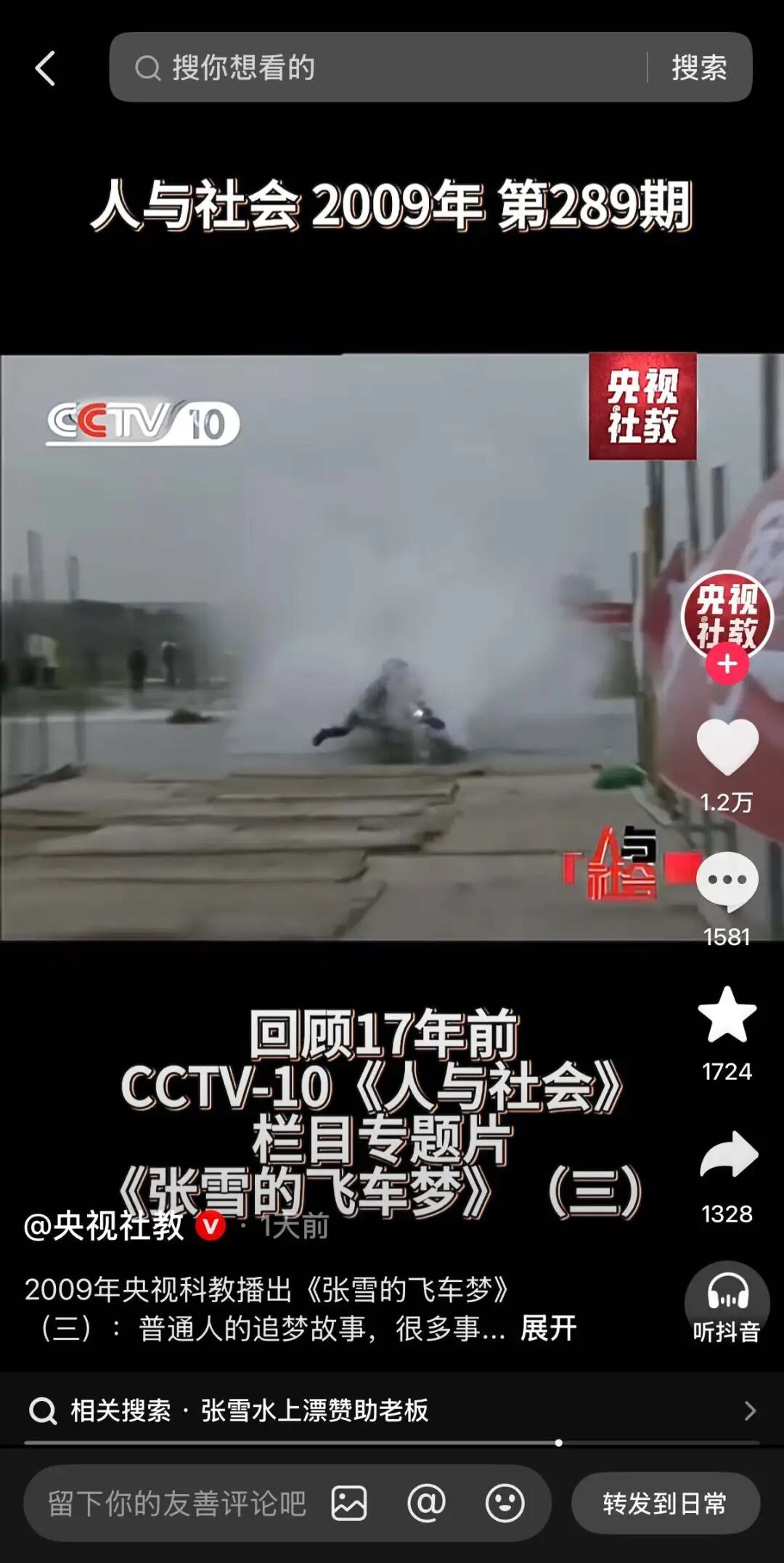 与此同时,张雪的摩托车梦仍在继续,2009年,他还找到央视《人与社会》栏目,希望表演一次“水上飞车”,贡献出了“蒙眼装发动机”的名场面。