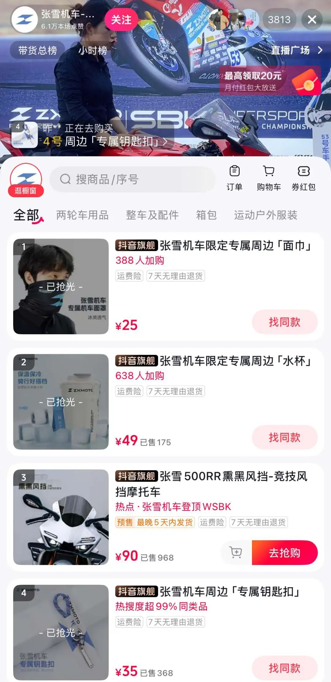新榜编辑部注意到,在抖音,张雪机车一些地方门店账号的直播热度直线上升,单场直播在线人数上千。而且,直播间内腰包、徽章、玩偶等多款张雪机车限定周边均已售罄。