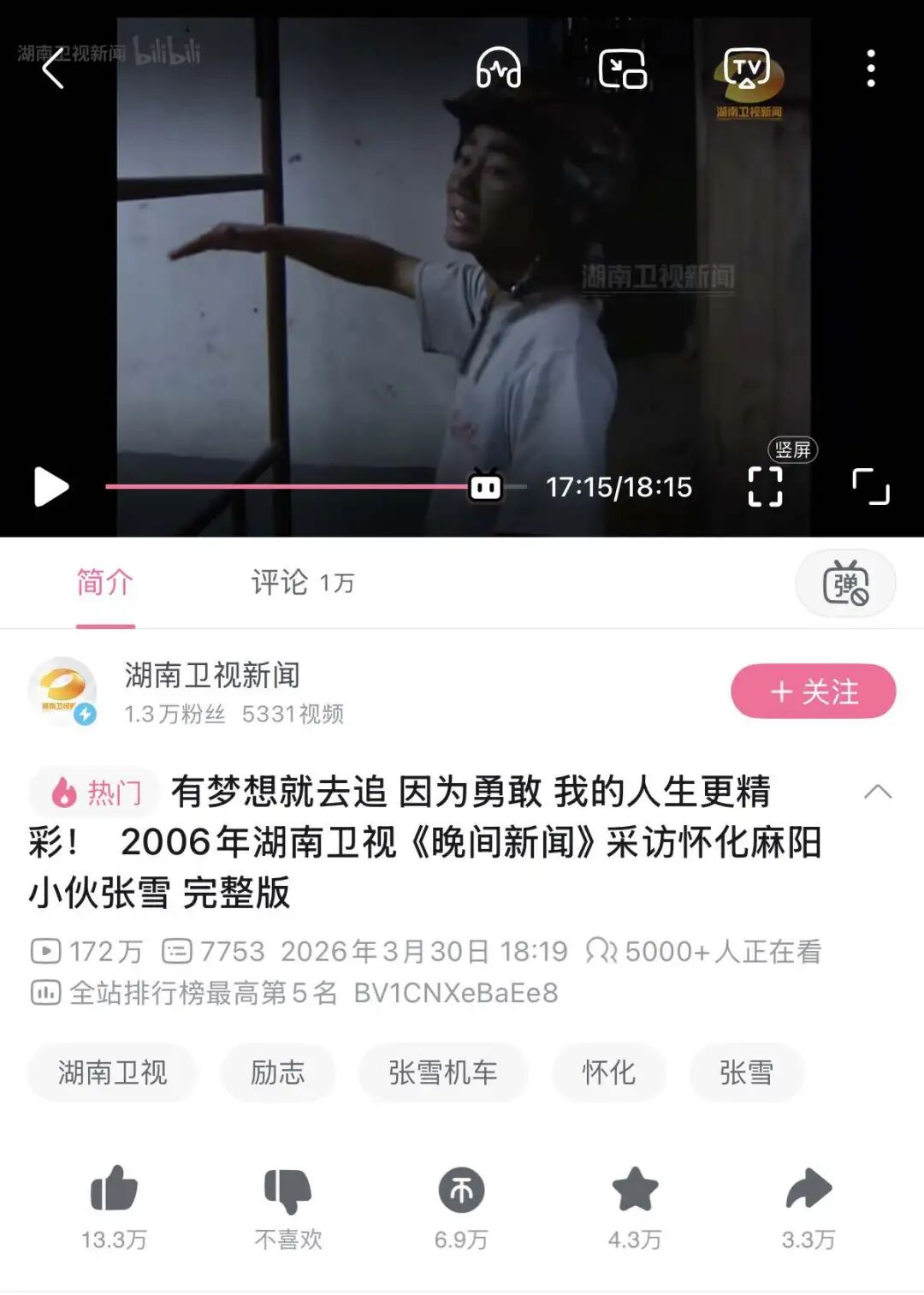 最近,张雪再次走红后,这条20年前播出的视频也被再次翻出,发布在“湖南卫视新闻”的各大社交账号,截至目前,该视频在B站的播放超172万,登上全站排行榜第5;在抖音获赞近20万。