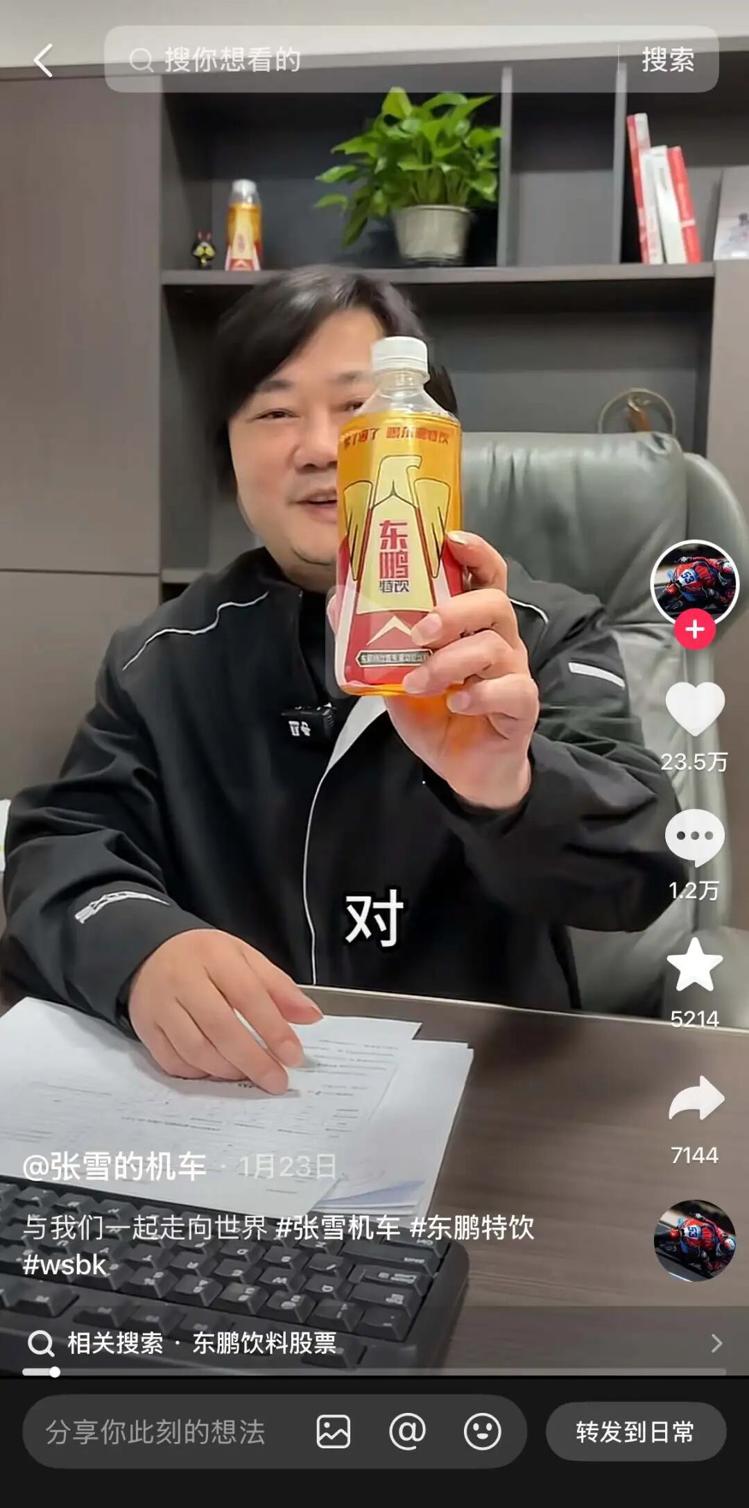 值得注意的是,接到流量的不只有张雪及其品牌,还有东鹏特饮。