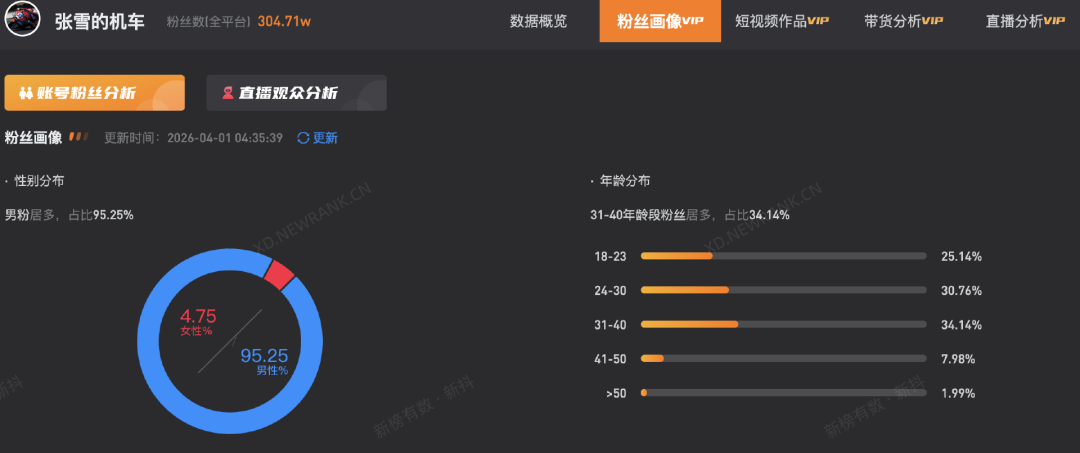 具体来看,“张雪的机车”抖音账号的粉丝画像以男性为主,占比95%,年龄段聚焦在31岁-40岁,或许这部分人恰好在张雪身上看到了理想中热血的自己。