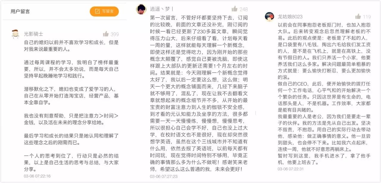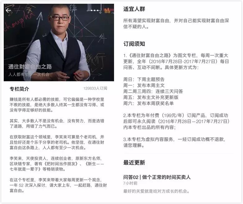 罗振宇:它的名字叫《通往财富自由之路》,但在产品介绍里说得非常清楚:不是教你怎么挣钱,而是“一个能让你变得更值钱的专栏”。如果你愿意花199元去看看专栏下的留言,就知道他的用户对他的认可度有多高。
