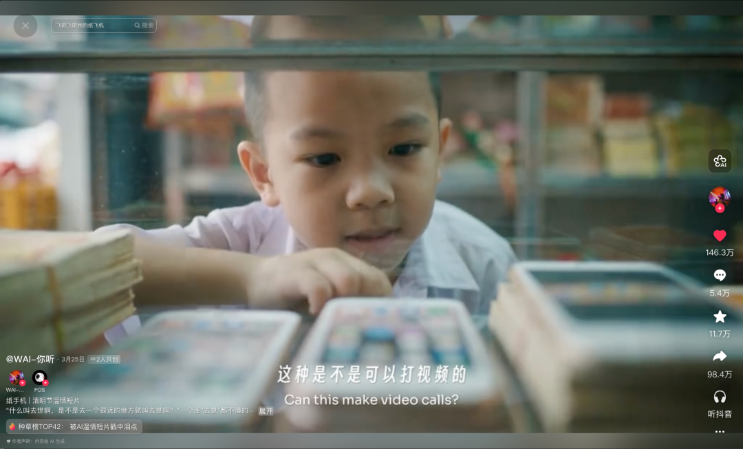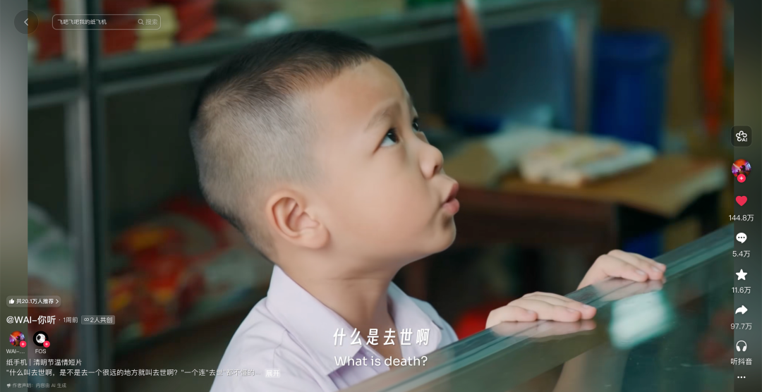 当AI短片遇上人文议题与情感叙事,《纸手机》的出圈让人们愈发看到用AI技术来承载情感表达的可能性。创作者可以用AI塑造出一个不懂“去世”含义的懵懂孩童,也可以将人们日常最怯于表达的思亲之情,通过AI短片的形式宣之于众。