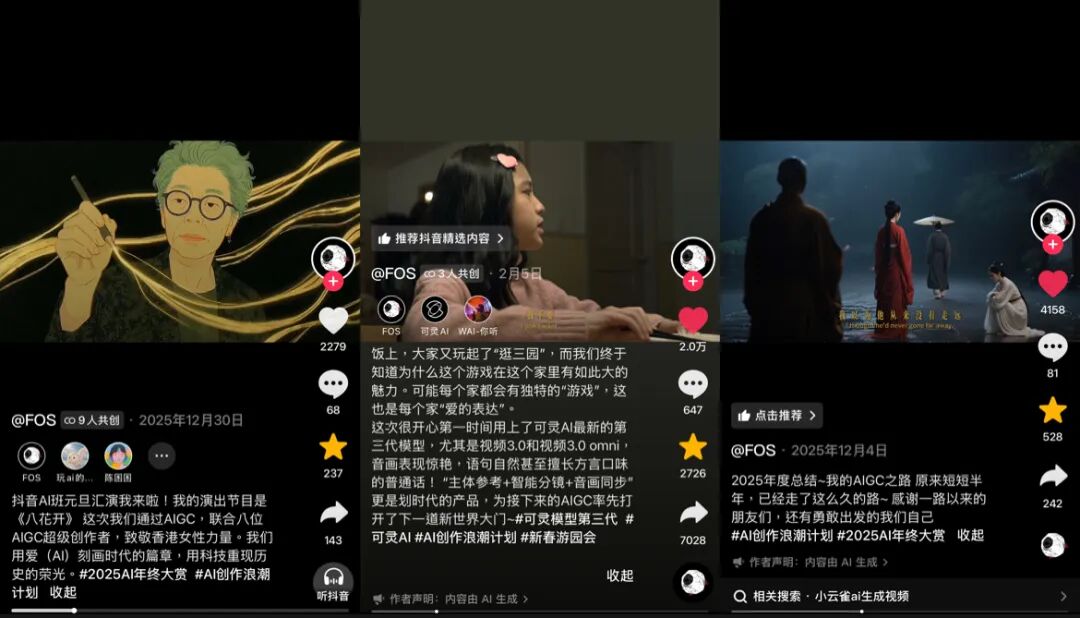 新榜编辑部观察到,早在去年12月,WAI工作室就通过“WAI-你听”“FOS”等抖音账号,发布了多条结合中国传统节日做成的AI短片,还参与了#AI创作浪潮计划 #抖音AI班元旦汇演 #AI新春游园会 等抖音优质AI内容扶持计划。
