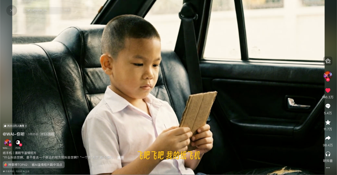 以《纸手机》的片尾曲《纸飞机》为例,这是一条用AI生成、时长近三分钟的一镜到底视频,画面内容也十分简单,就是视频主角小男孩坐在车里,反复端详纸手机。