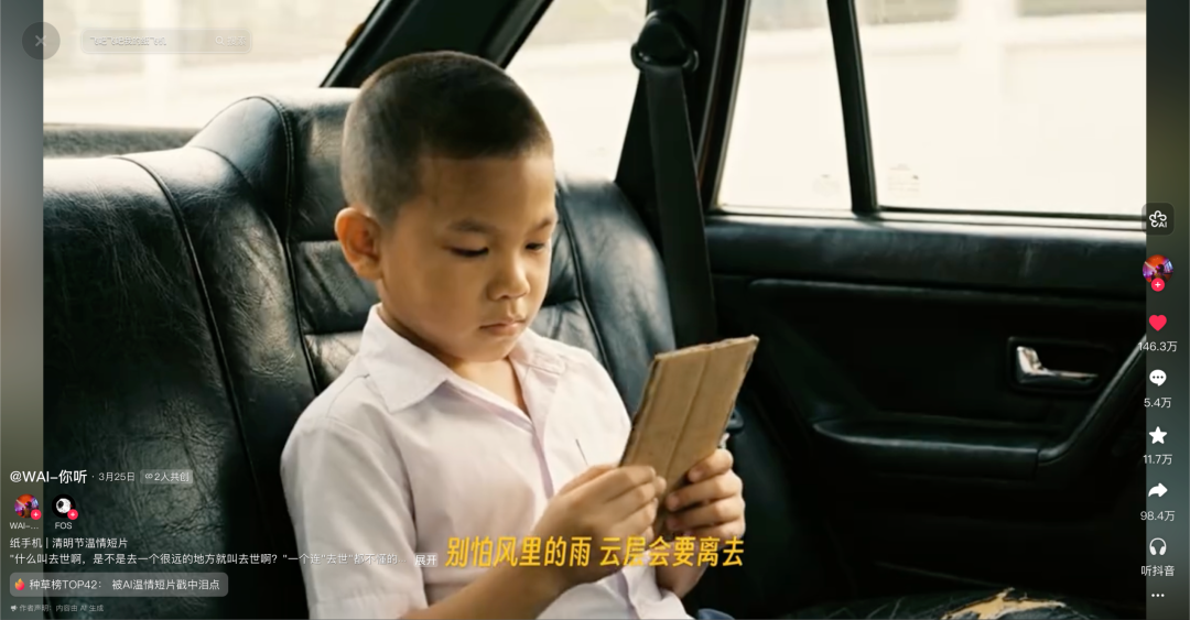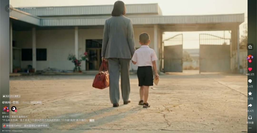 这部AI短片之所以能够在短时间内获得千万级播放和百万级点赞,原因首先不外乎清明节这个特定的时间节点,大众本身就处于缅怀故人的情绪中。《纸手机》整部片子没有过度渲染悲伤,也没有嚎啕大哭的生离死别,这种克制和留白的表达方式,反而产生了巨大的情感张力,给观众留下了充分的共情和想象空间。
