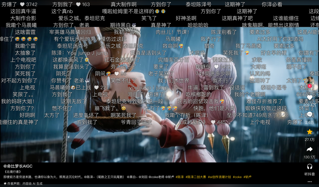 无独有偶,近期在抖音走红的作品《北境行者》中,随着剧情发展,故事氛围时而紧张、时而诙谐,网友们的弹幕也会相应起伏。