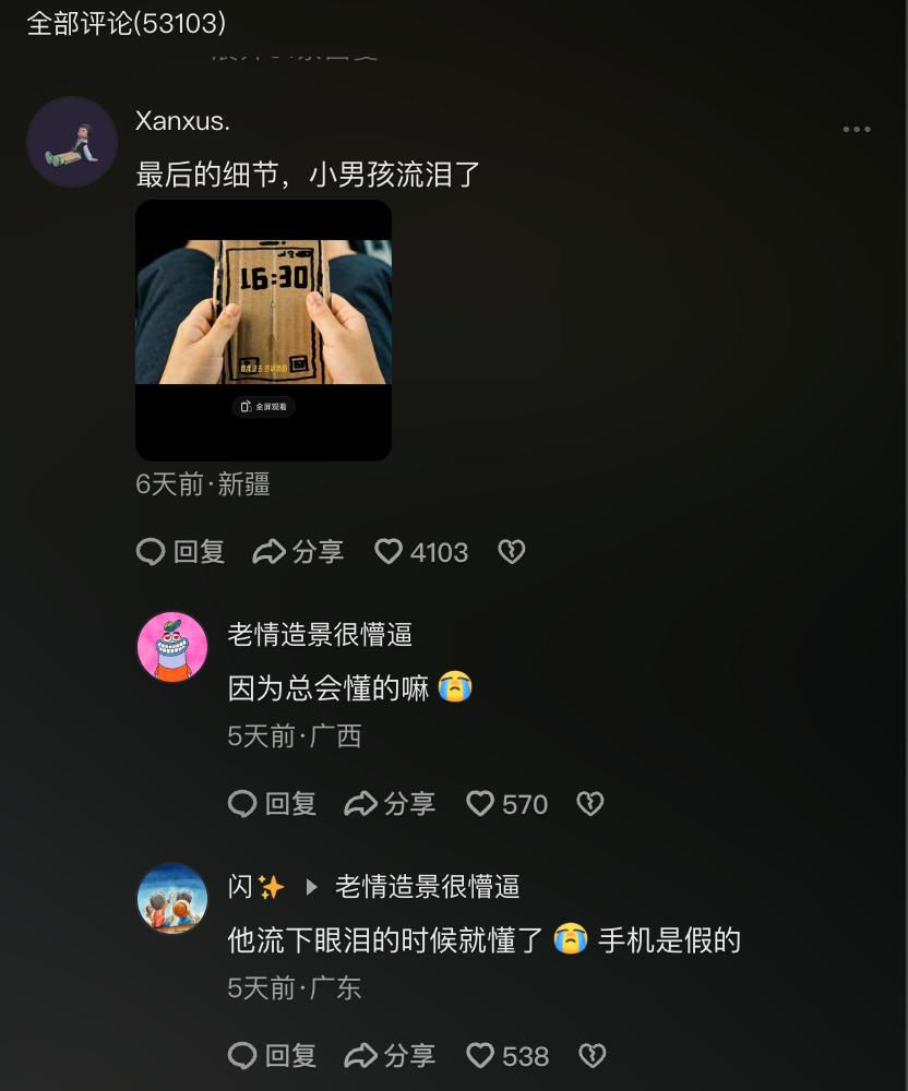 在《纸手机》的评论区,可以看到很多网友都在讨论短片的细节。结尾处小男孩举起那只纸折的手机时,纸板上有眼泪滴落的晕痕。