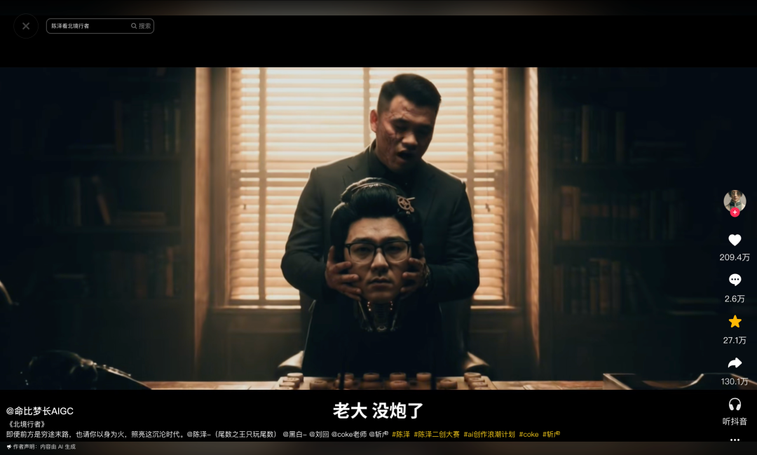 除了精致凝练、专攻视效的AI短片,近期抖音的AI创作浪潮计划下,还涌现出不少精于故事表达的中长视频。比如由“命比梦长AIGC”创作的25分钟微电影《北境行者》,在脑洞大开的未来世界中探讨人性。这条视频在抖音获得超209万点赞、130万转发。