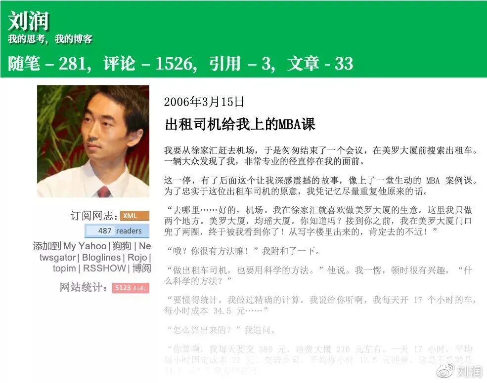 早在2003年,还在微软任职的刘润就开始在个人博客上更新文章,并在3年后写出了爆文《出租司机给我上的MBA课》。