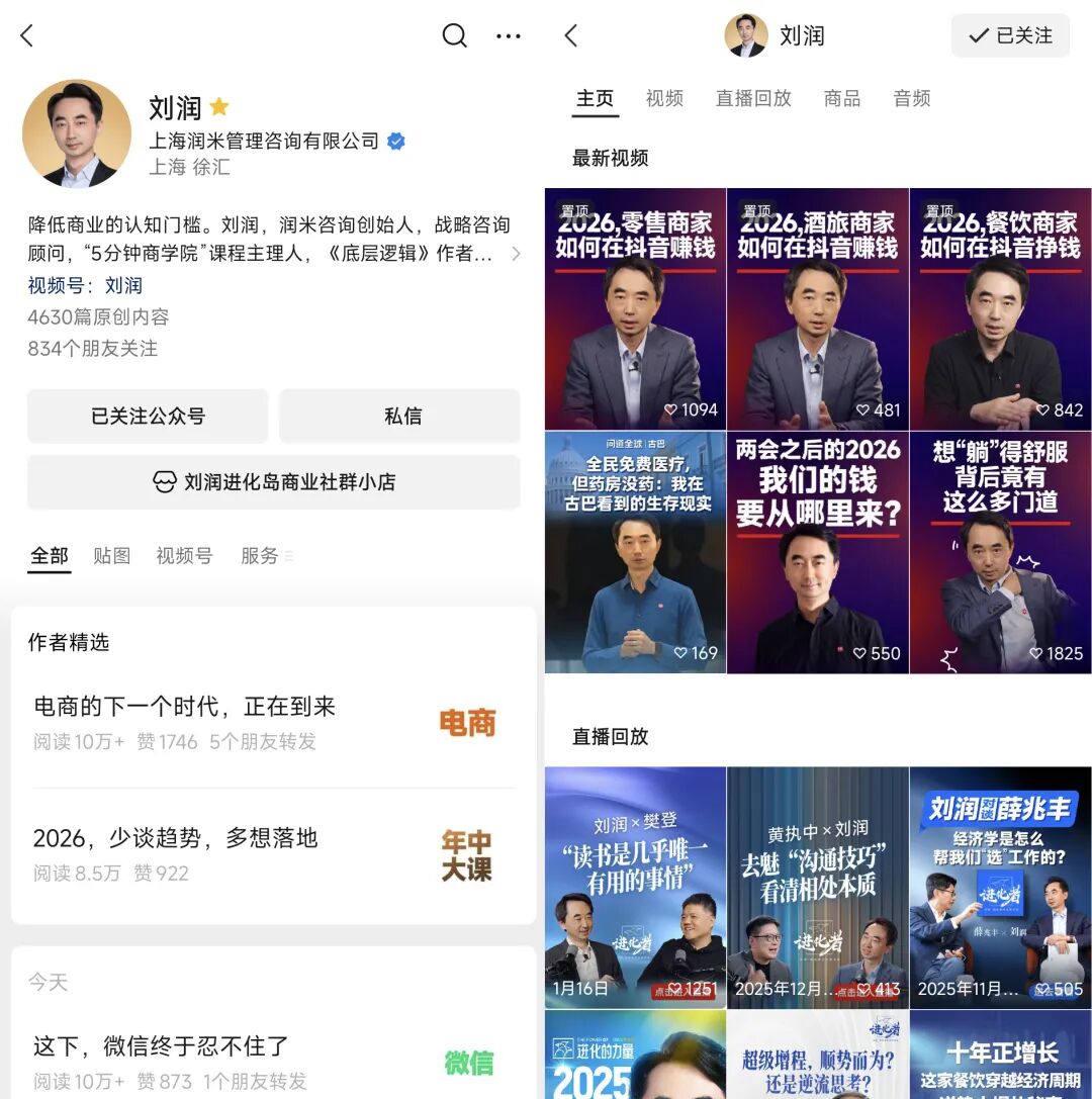 刘润团队则需要围绕刘润的真实洞察完成公众号、视频号等媒体矩阵的内容产出,常年保持2个星期以上的内容储备。