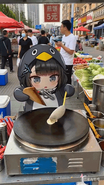 时而化身街头小摊主,给顾客准备煎饼果子、炒饭等美食。