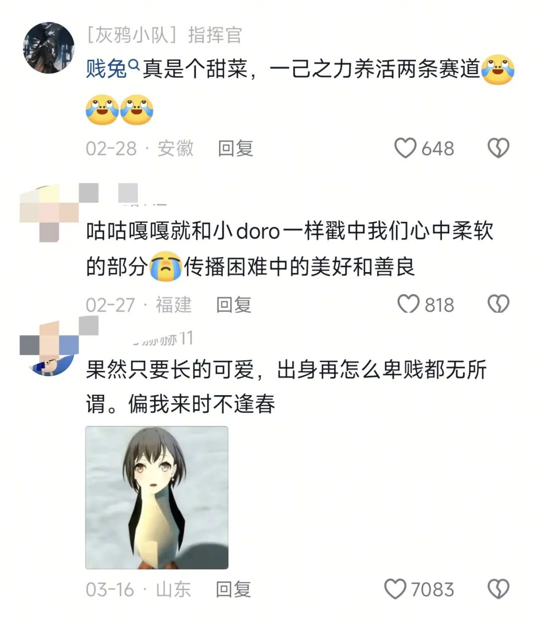 在咕咕嘎嘎的二创视频中,治愈是最鲜明的标签之一。比如《小企鹅和Doro的避暑小洞》和《小企鹅和Doro一起摘了一筐美味的橘子》两条视频,就有一种宫崎骏动画的治愈感。一位网友留言:“莫名有种《千与千寻》的感觉。”