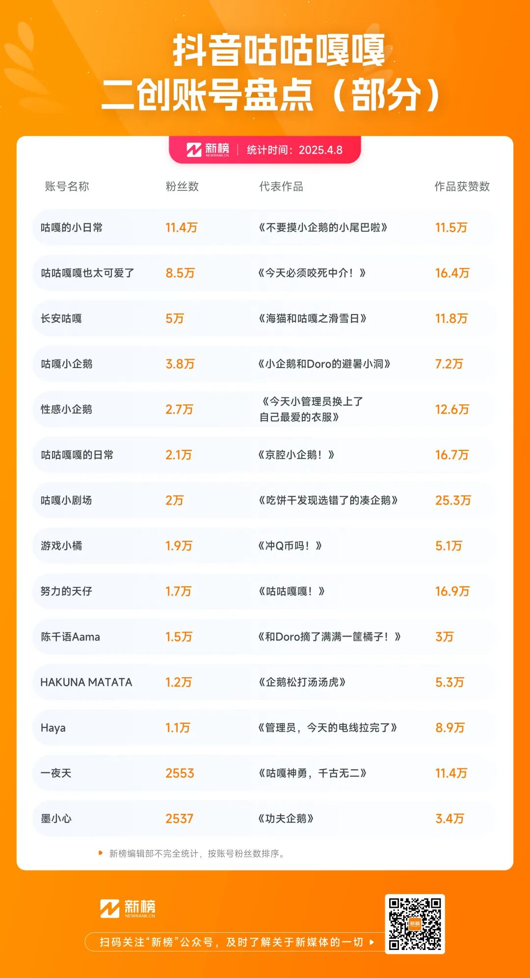 • “新媒体,找新榜”是我们的使命。凭借全面稳定的内容资产企业级应用能力,新榜先后获得“上海文化企业十佳”称号、上海市专精特新企业、上海数字广告领军企业、CNAAⅠ一级广告企业。同时,新榜完成了ISO20000、ISO27001认证和网络安全等级保护(三级)测评,上海母公司及北京全资子公司被评定为国家级高新技术企业,拥有多个新媒体内容资产管理应用的发明专利。浏览器搜索新榜官网,获取更多新媒体动向。