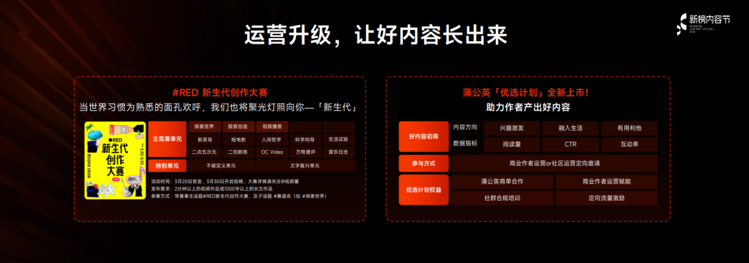 左边的是“RED 新生代创作大赛”,这是小红书上半年最重要的一个创作内容向活动。这个活动我们主要鼓励两分钟以上的中长视频和1000字以上的长文参赛。创作者只要带上赛事主话题和子话题的赛道名就可以视作参赛,瓜分百亿流量池。