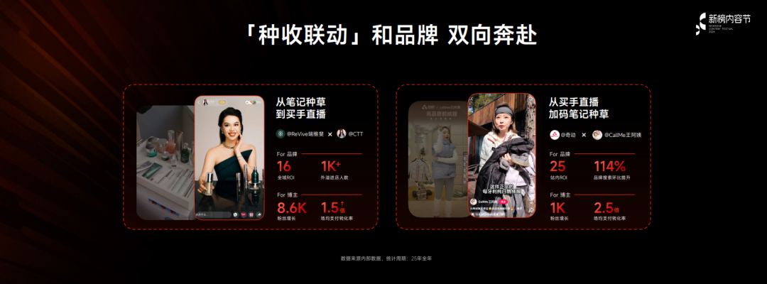 我想借用种收一体的链路,分享两位双身份博主的案例。种收一体是小红书在2025年11月份推出的一个新模式,它意味着品牌方可以同时下单一篇种草笔记和一个直播。在这个新链路下,品牌方会获得更好的流量算法推荐。目前已经有200个品牌和将近1200位博主尝试了这条链路,场均支付转化率可以提升1.2倍。