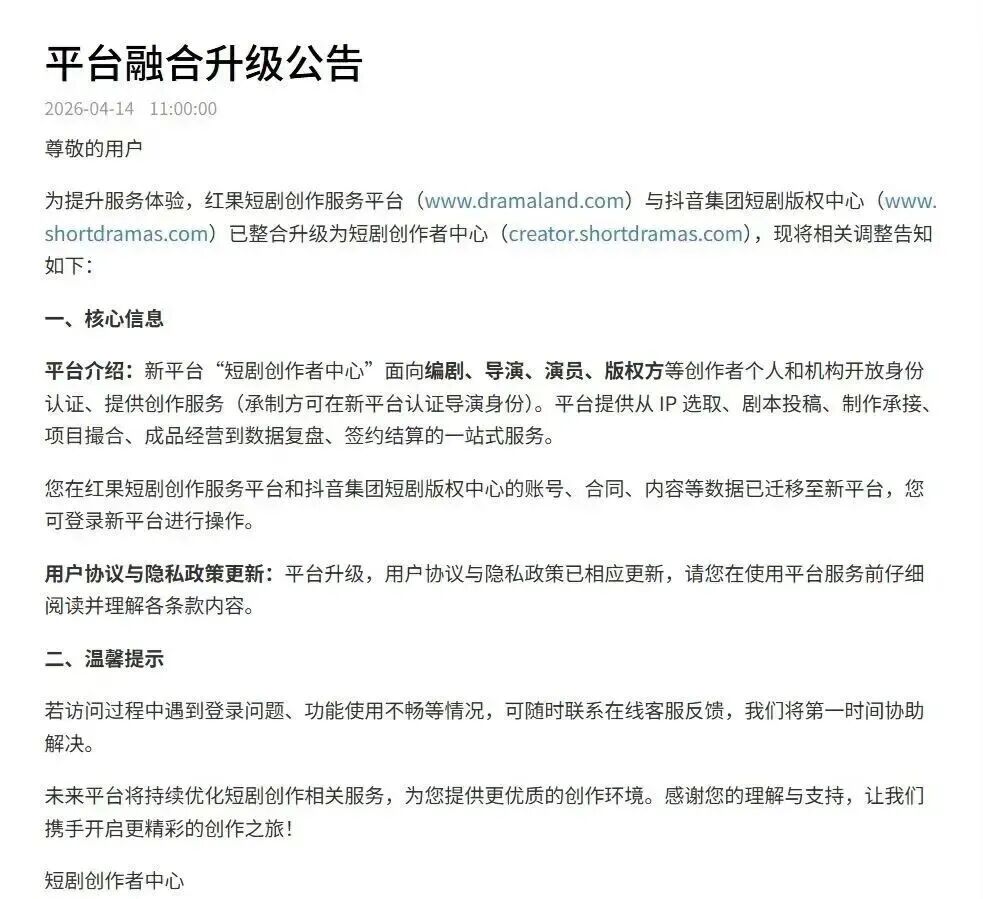 据了解,新成立的短剧创作者中心将面向编剧、导演、演员、版权方等创作者个人和机构开放身份认证、提供创作服务。平台将提供从IP选取、剧本投稿、制作承接、项目撮合、成品经营到数据复盘、签约结算的一站式服务。