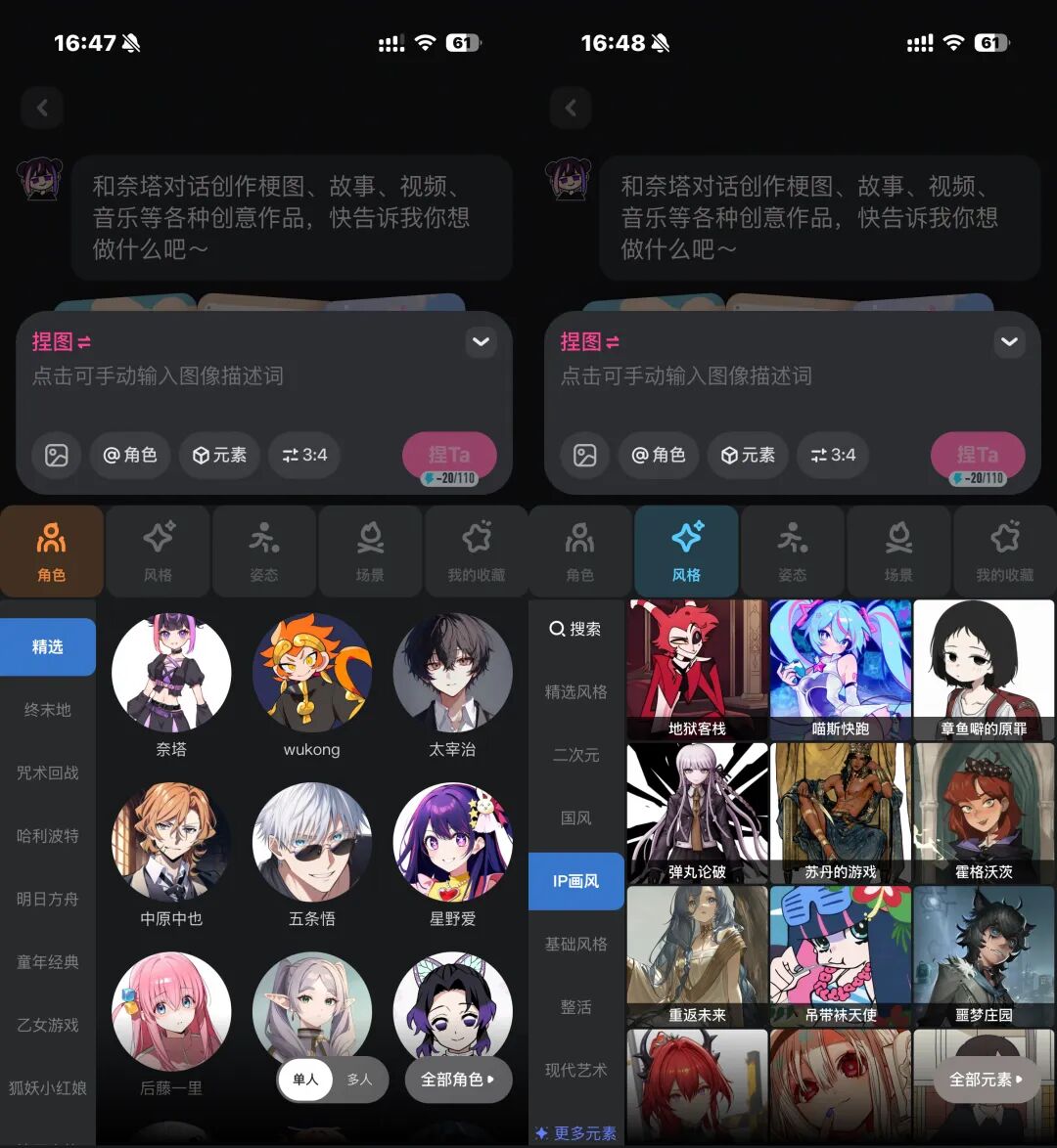 在“自由捏图”模块中,复杂的AI绘图参数(如风格、背景、构图、角色姿势等)被转化为清晰的可视化选项,通过点选即可完成创作。