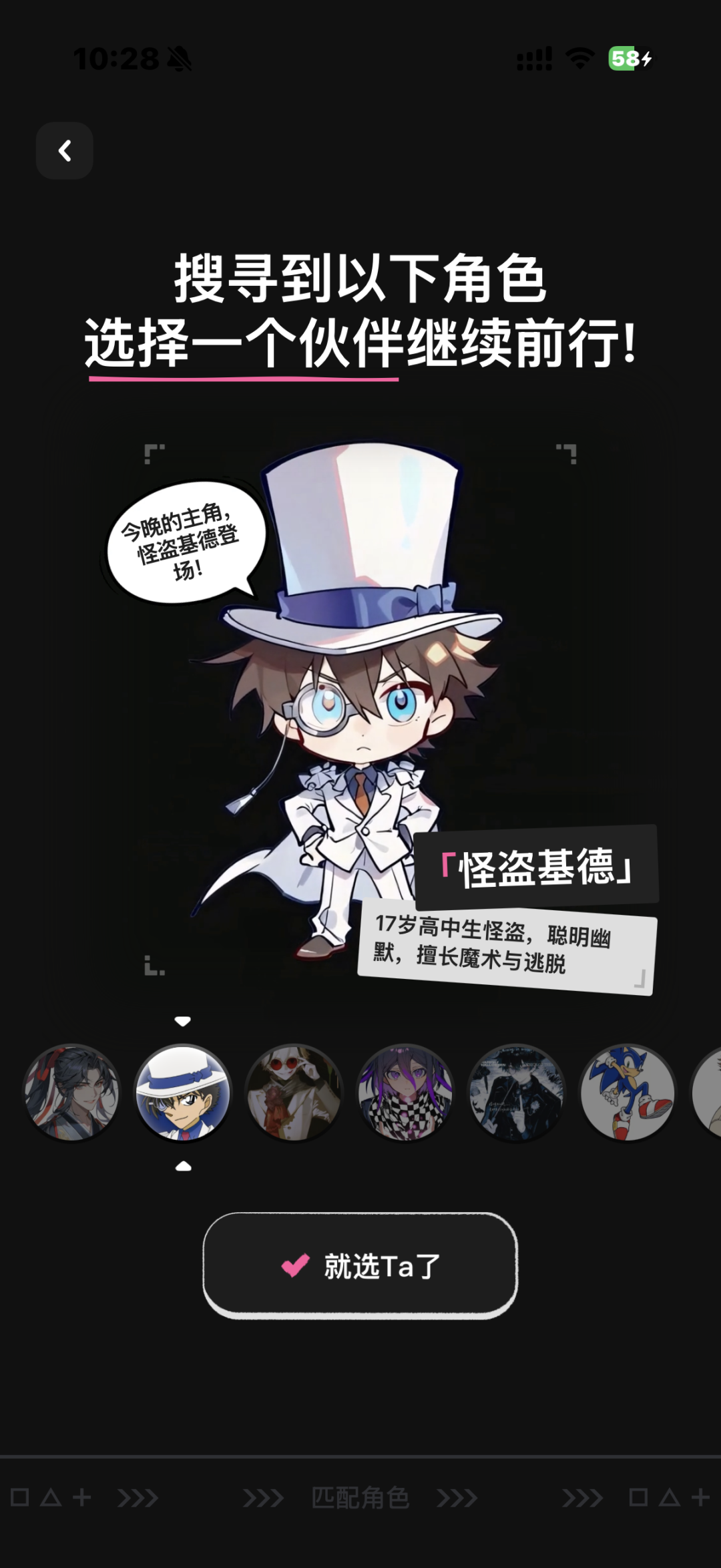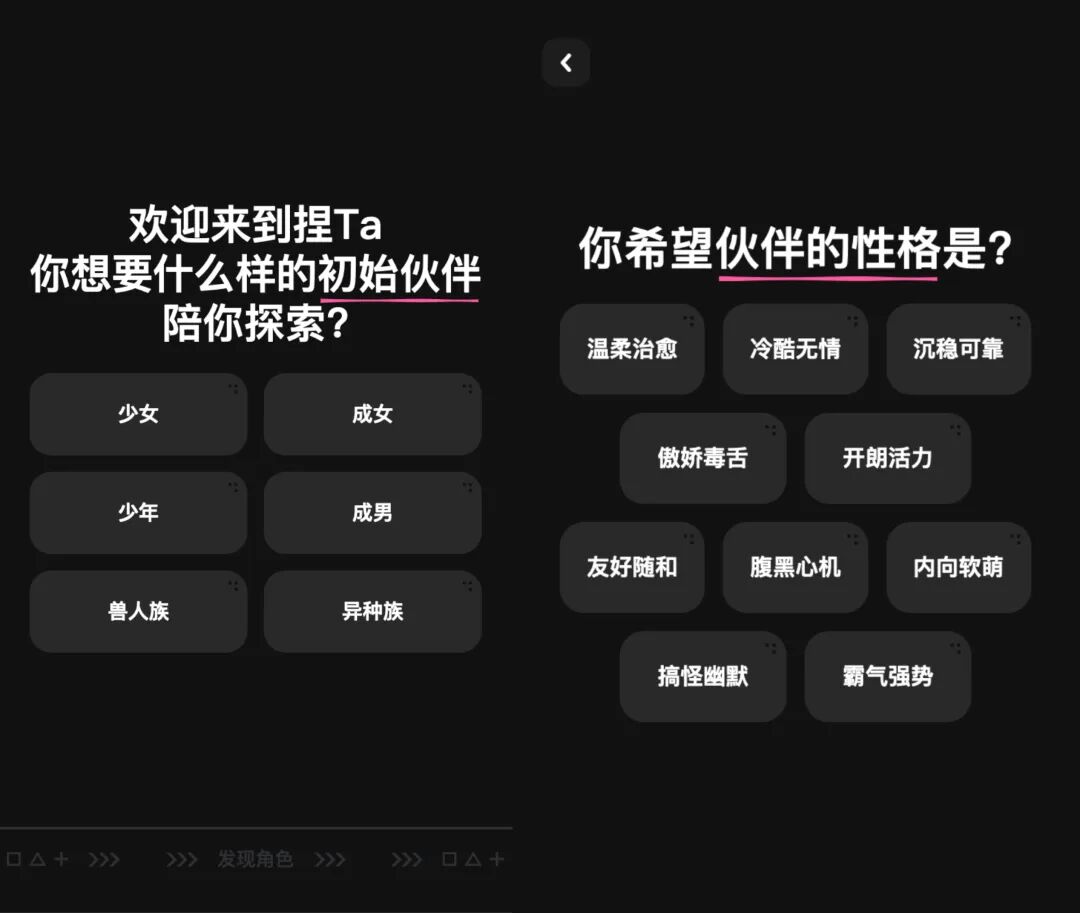 在捏Ta App的初始引导中,需要先选择一个初始伙伴进行探索,选项按二次元受众最熟悉的人物属性进行了分类。在选择了“少年”和“搞怪幽默”的性格后,系统随机为我匹配了一批角色,大都是知名度较高的成熟IP,比如敖丙、怪盗基德、太宰治等。