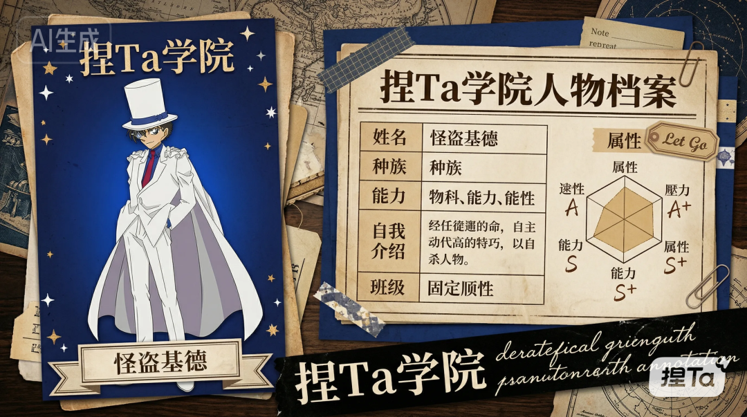 比如我刷到一张复古拼贴风人物档案卡,点击下方的“为Ta做同款档案卡”,就会进入和AI的对话界面,自动提取该模版的提示词并以原图为参考。大约等待了十几秒,一张完美融合了怪盗基德形象、属性的学院档案卡就出炉了,支持二次修改、抠图和让图片动起来。