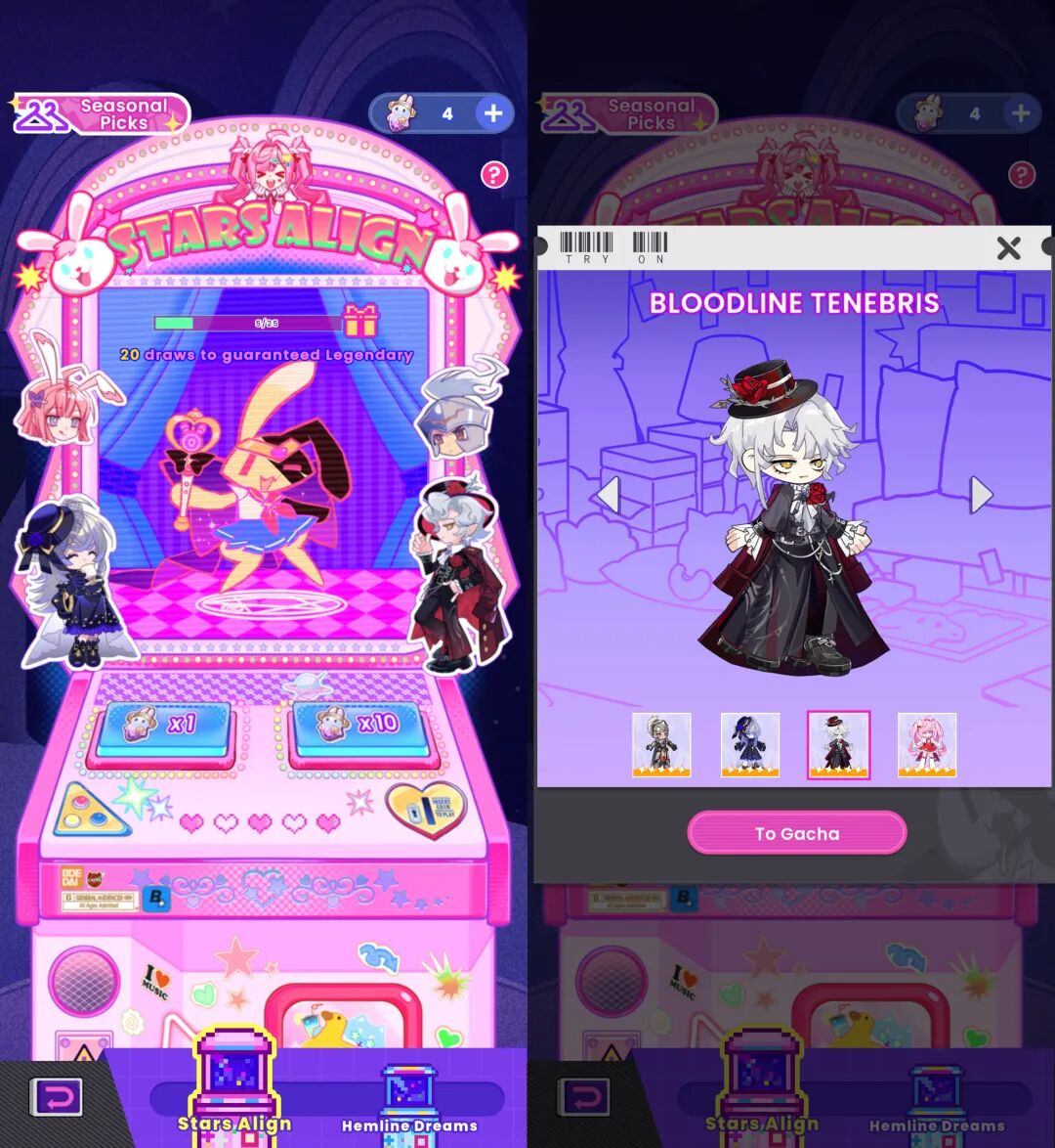 在变现模式上,Bside借鉴了Roblox的虚拟形象经济思路,玩家可以在商店里通过抽卡或直接购买来获取各种OC的服装配件。通过参与日常的Adventure和Playground,可以赚取金币,用于抽取普通的服装。而想要获取更稀有、更精美的限定外观,则需要通过充值购买高级代币。