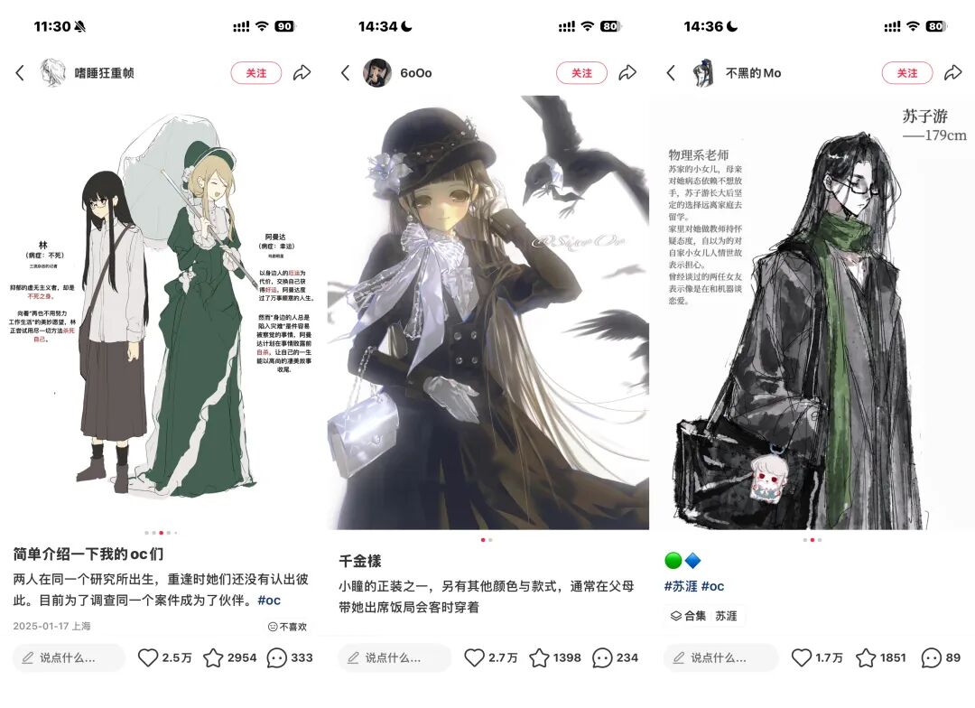 一个成熟的OC,需要拥有独特的外貌特征、鲜明的性格锚点、人际关系、完整的背景故事,甚至需要一整个自洽的世界观来支撑。很多创作者会在社交媒体、同人社区展示和分享自己的OC。