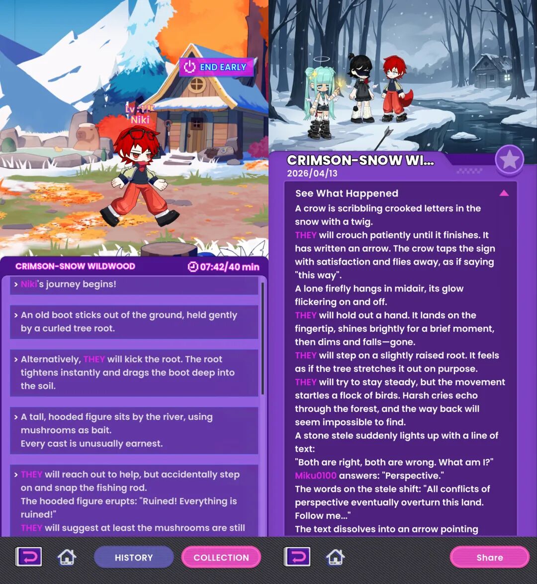 但这个模式目前整体画风有些简陋,Biibit只是一个在2D场景中循环播放步行动画的贴图,探险过程中的奇遇是像流水账一样的文字描述,有些枯燥和无聊。