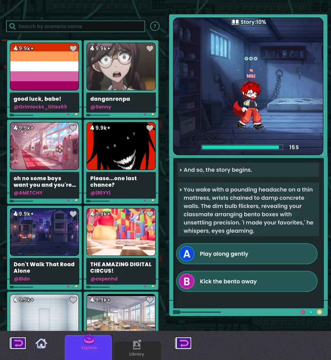 在Playground模式中,你可以让自己的OC去体验由自己或其他玩家创建的剧本。这种体验很像传统的AVG文字冒险游戏,这是一种以故事剧情为核心的电子游戏类型,通常被称为“电子小说”或“交互式小说”。你需要根据不同场景和剧情分支,决定剧情走向。