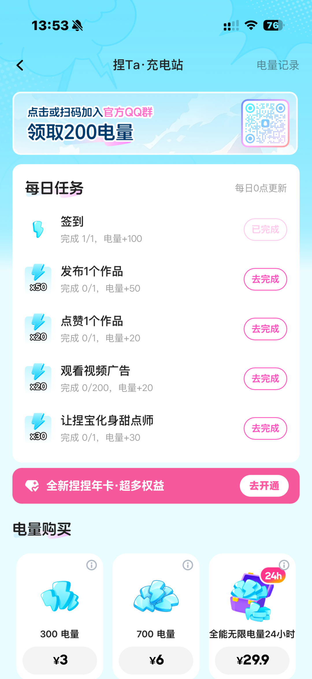 对于那些不愿意花钱的用户,捏Ta还设计了一套极其详尽的“每日任务”系统。 除了常规的签到、发布作品、点赞互动可以赚取微薄的电量外,它甚至允许用户每天观看最多200次视频广告(每次奖励20电量)。