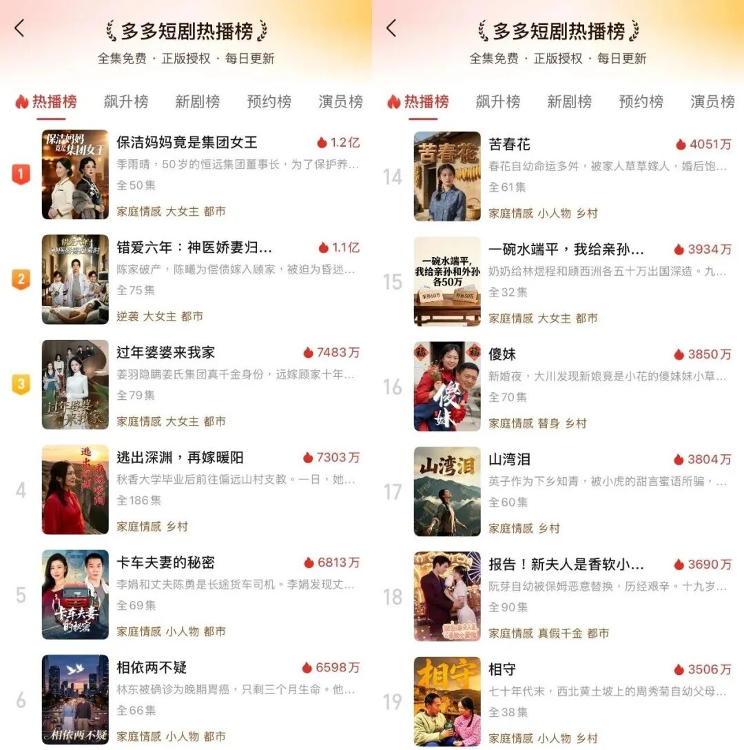 以抖音和拼多多为主要阵地,我们梳理了当前市面上热门的乡村短剧。