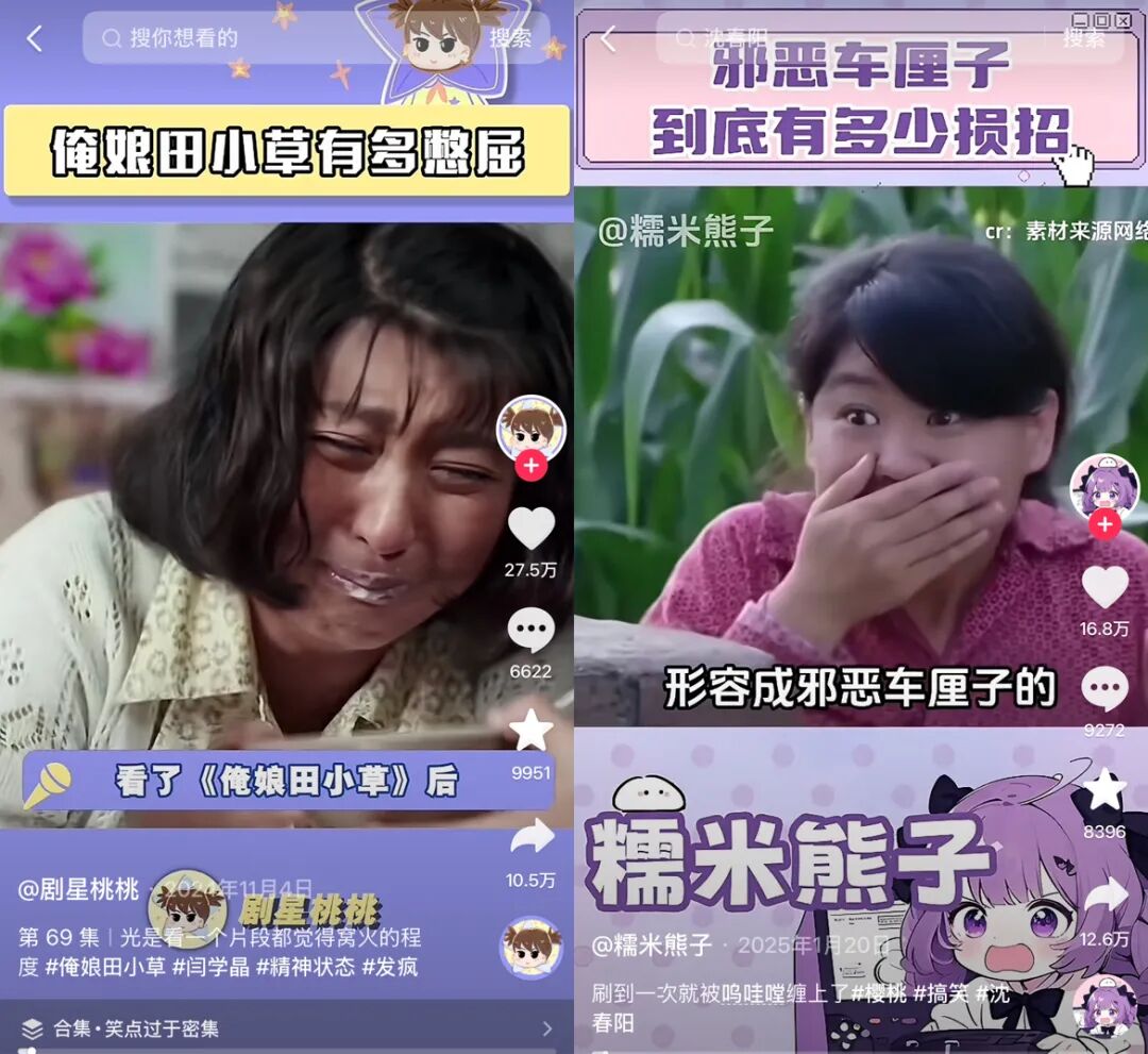另一方面,大众对乡村题材剧情有着天然的、持续的渴求。近两年,《俺娘田小草》翻红并被网友二创出“俺娘田憋屈”等玩梗作品;赵本山携“赵家班”主演的苦情乡村剧《樱桃》也再度翻红,其主角被网友奉为“邪恶车厘子”并重新席卷网络,相关话题在抖音获得超10亿次浏览。
