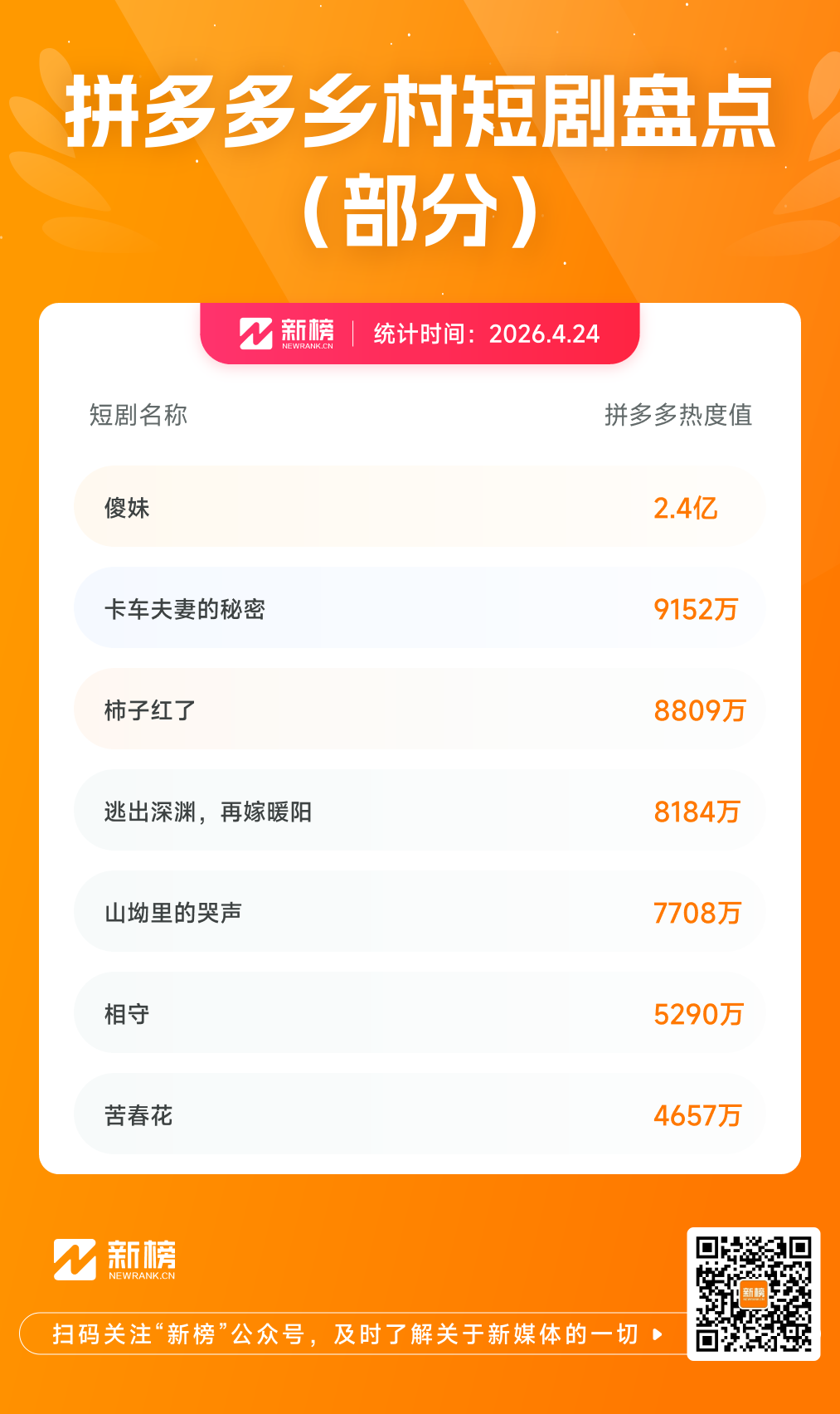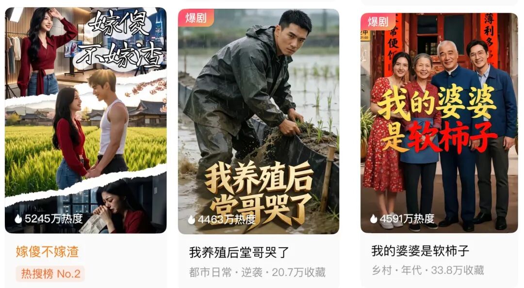 新榜编辑部发现,最近一段时间里,在红果、抖音乃至拼多多等平台,种田养殖、婆媳妯娌、重卡司机等乡村生活题材短剧,纷纷登上热播榜单。