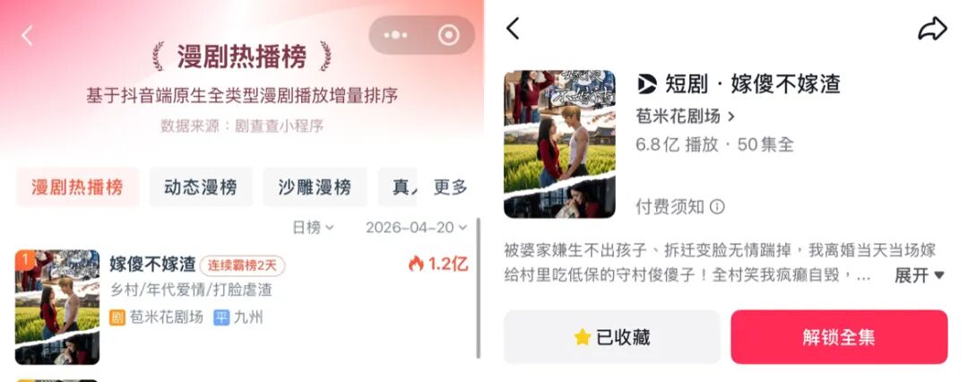 女主不嫁大款嫁傻子,抛下拆迁户跟着傻老公吃低保,但数据证明,土到极致就会“爆”。这部短剧4月18日在抖音上线,3天内播放量超4.5亿,截至目前抖音播放量已突破6.8亿,红果收藏数超16万,最高排名红果热度榜第9。