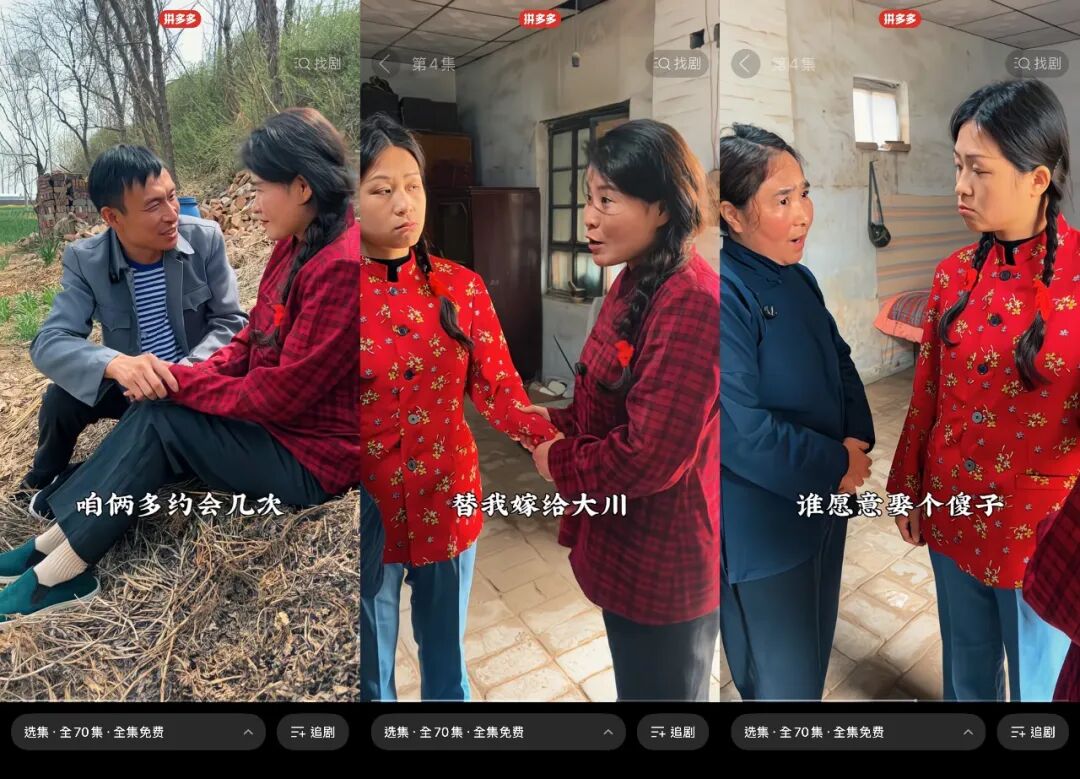 据观察,红果、抖音上的乡村短剧,和拼多多上的爆款乡村短剧,呈现出两种完全不一样的内容风格。