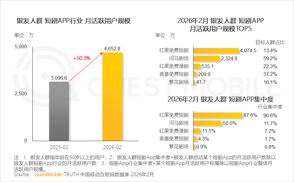 QuestMobile在今年4月发布的《2026短剧行业洞察报告》显示,截至2026年2月,短剧行业整体覆盖用户已达7.18亿,其中三线及以下城市活跃用户在短剧App行业占比过半,50岁以上银发人群月活数量超4653万,同比增速超50%。