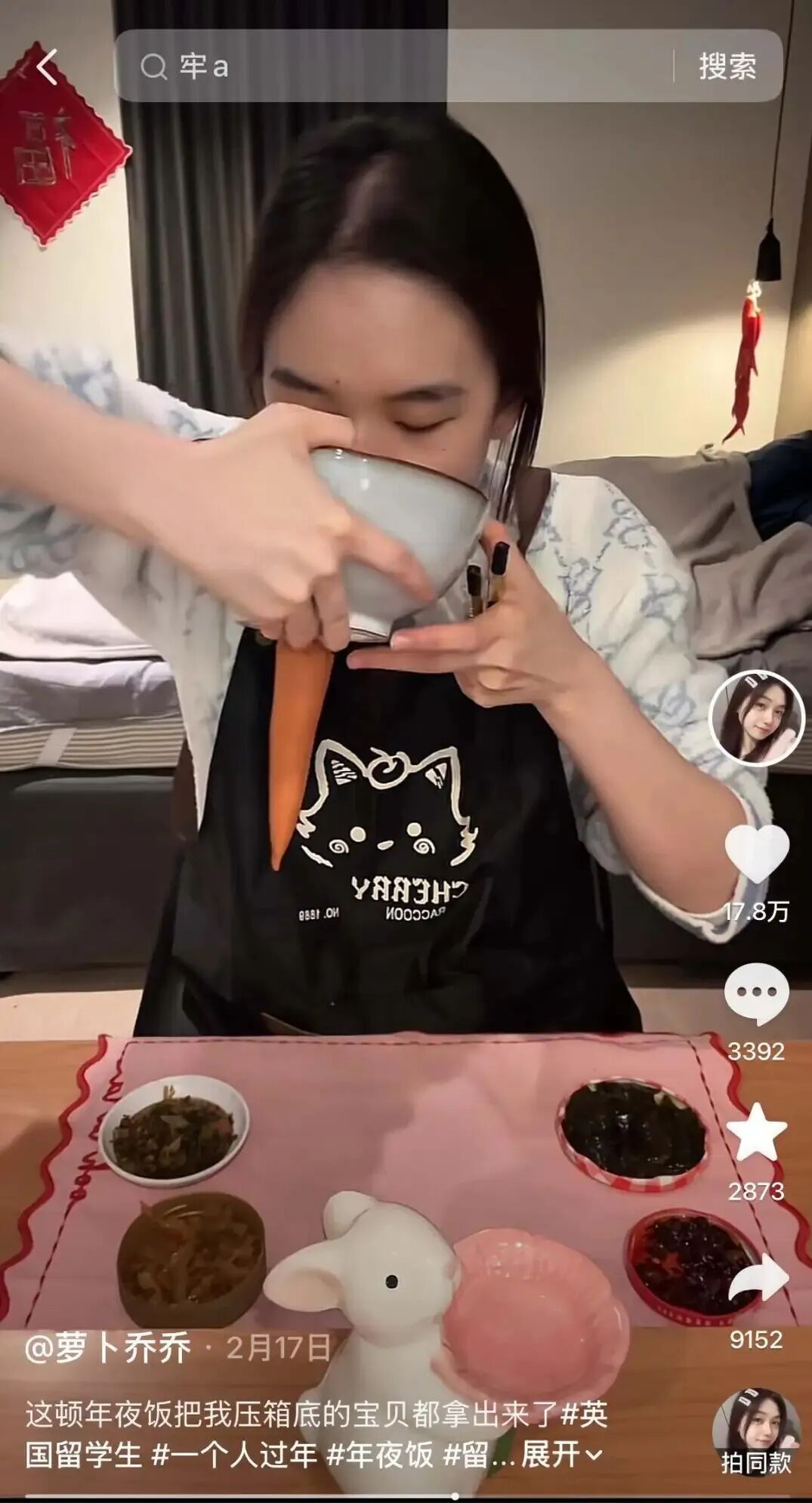 尤其是到了过节的时候,今年春节,她因为课业独自在英国过年,年夜饭就只有一碗包谷糁配四种咸菜。“要不是因为拍视频,我可能连这个都不吃”,她说道。