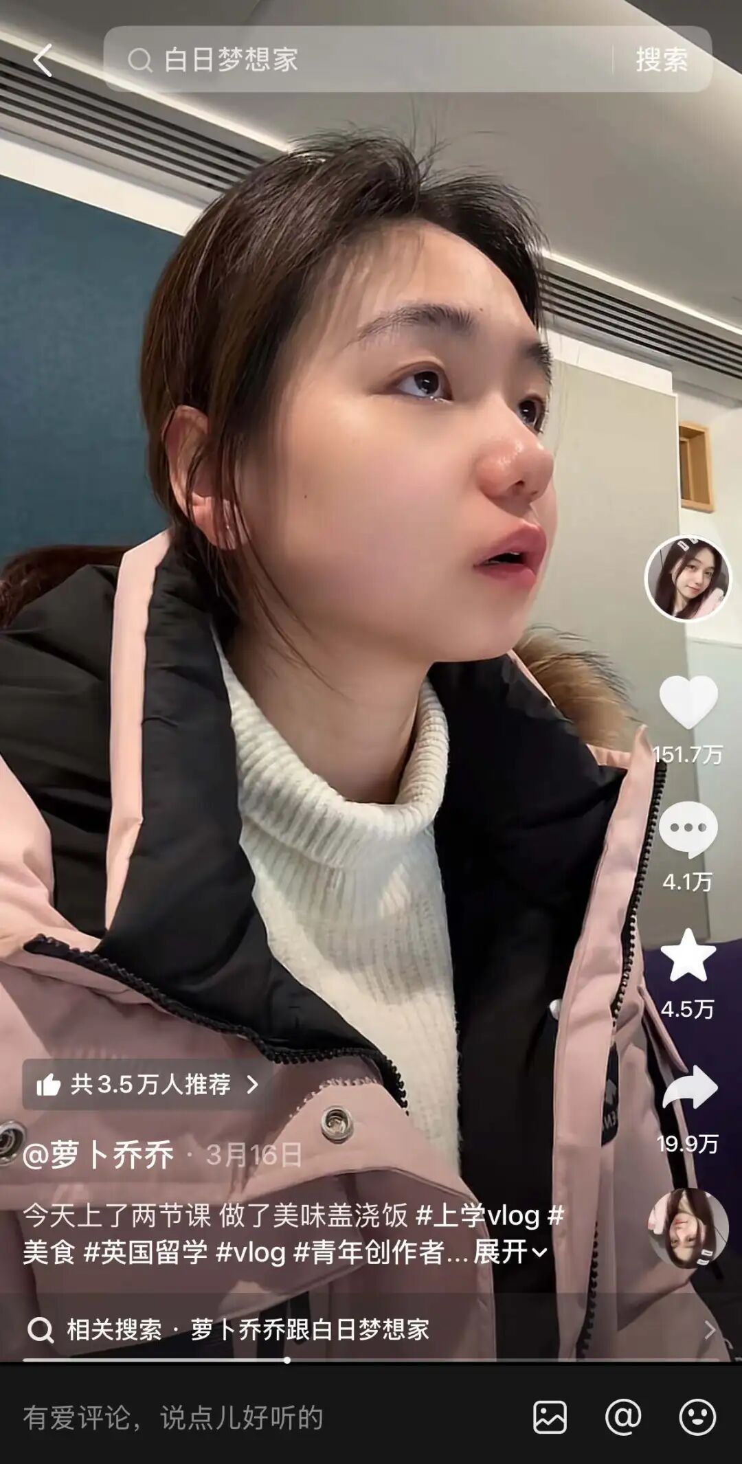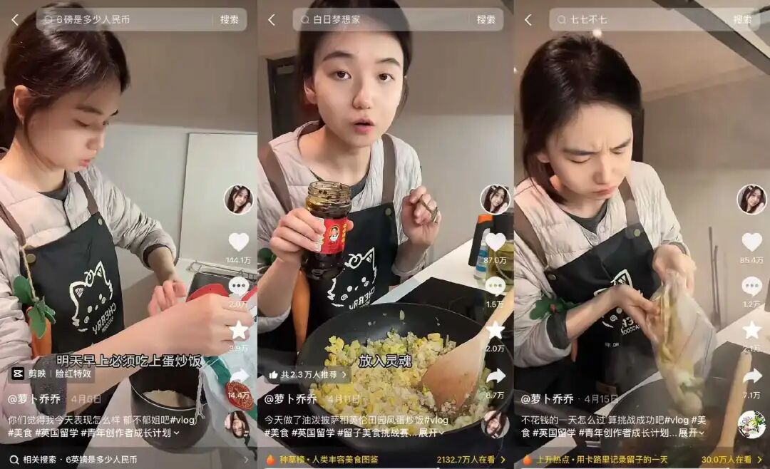 不过,起初“萝卜乔乔”这类单纯做饭的视频在抖音热度不算稳定,账号的粉丝量在7万左右,直到3月初,她开始尝试拍摄留学vlog,第一条vlog便在抖音斩获超150万点赞。