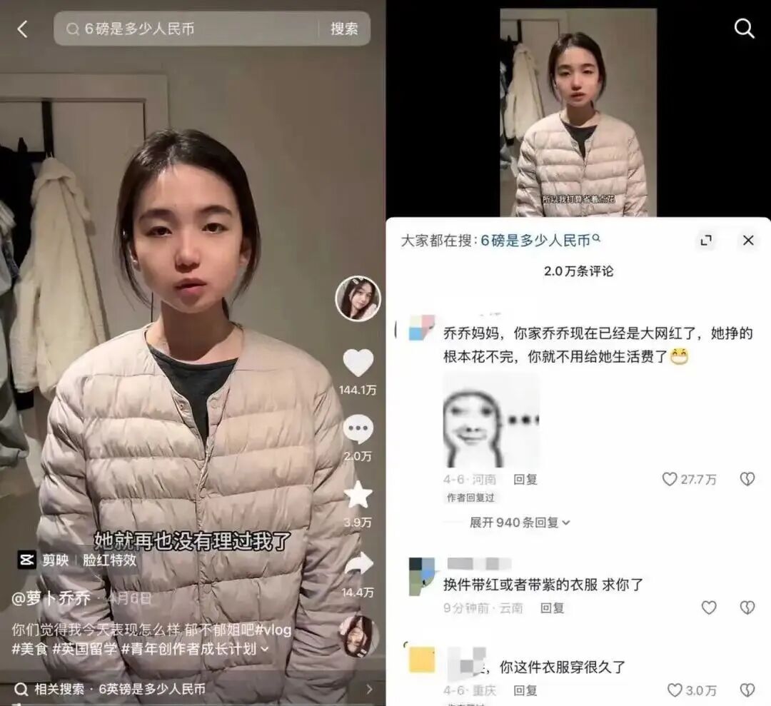 提到这个,“萝卜乔乔”也很苦恼,她说妈妈觉得她能自力更生了,真的打算停掉生活费。再加上,家人一直以为她在英国好好上学,结果一看视频天天迟到,更不愿意给了。