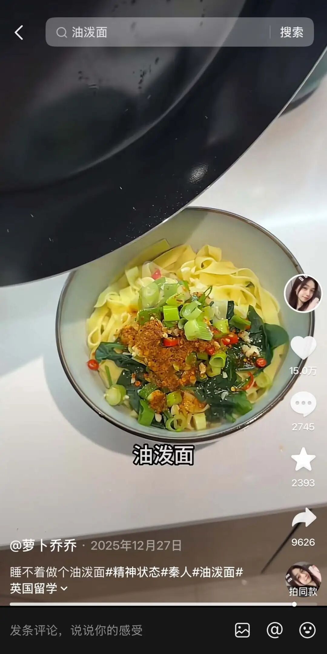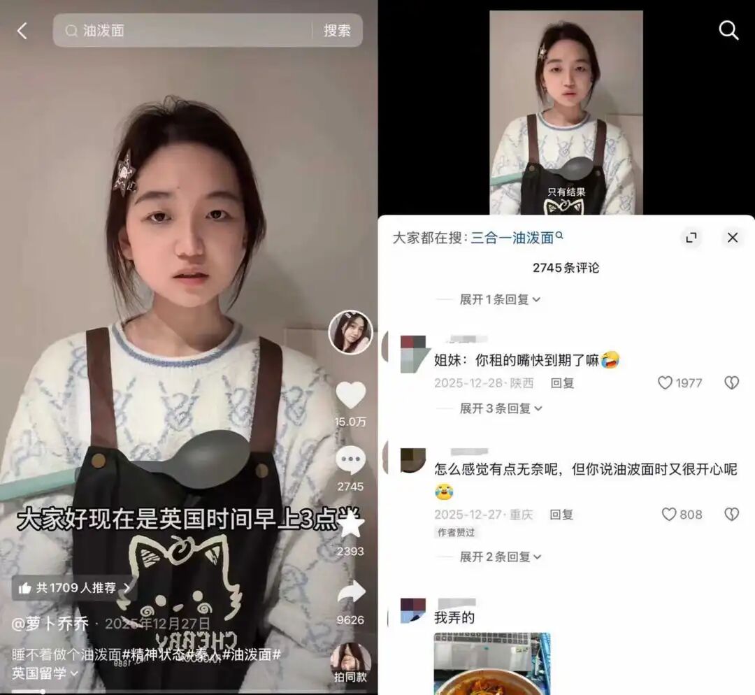 谁承想,这条仅有15秒的做油泼面视频收获了一批关注,在抖音获赞五六千,这对第一次接触自媒体的“萝卜乔乔”来说,已然是不错的成绩。