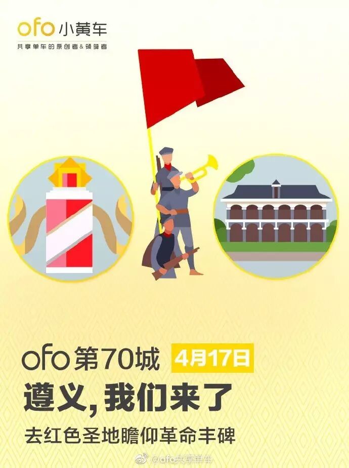 ofo则会在这时发布有当地特色的“再下一城”海报,如“ofo第70城:遵义,我们来了——去红色圣地瞻仰革命丰碑”。