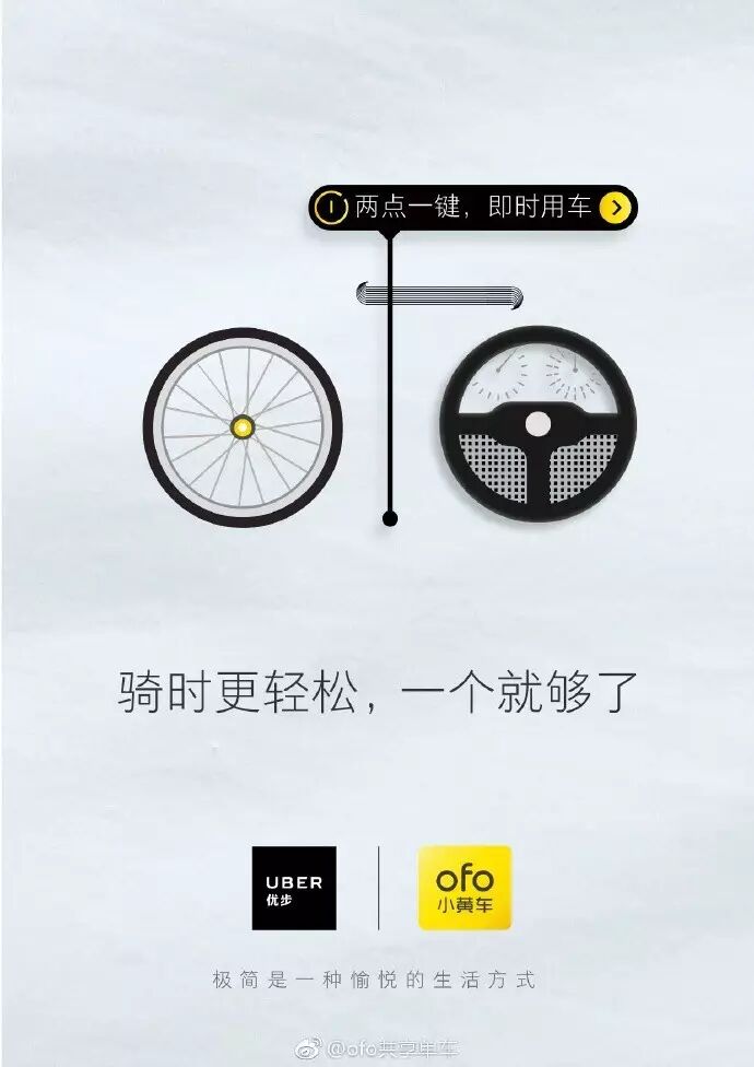 ofo则在4月11日与Uber联手,倡导极简的生活方式。并在海报上宣扬“骑时更轻松,一个就够了”。