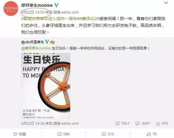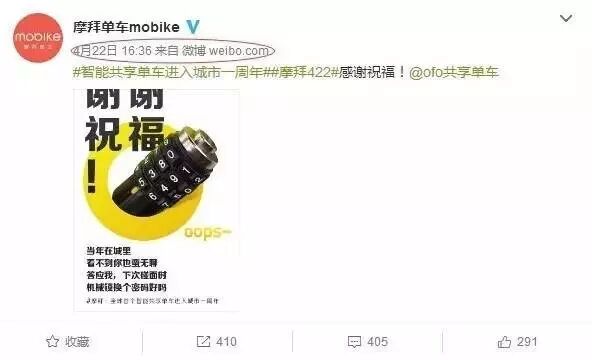 4月22日,摩拜单车成立一周年,摩拜举行了一系列的线上线下活动来庆生。不料,其老对手ofo 竟在微博上主动为摩拜庆生,并发了一张颇具争议的海报。