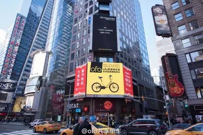 在海外的营销活动中,ofo也是更快一步。今年1月25日至28日(美国当地时间上午7点至10点,下午3点半至7点),ofo联合100家中国企业,在纽约时代广场路透社大屏,以《向世界人民拜年——百大中国品牌祝世界人民:新春快乐,大吉大利》为主题向全球人民传递新春祝福。
