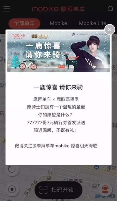 摩拜单车去年底就发起了“鹿晗愿望季”活动。活动期间,不仅用车图标变成了小麋鹿,而且当用户点击或预约某辆车后,小麋鹿就会露出微笑。同时,摩拜单车第一次发优惠券的机会也来自于“鹿晗愿望季”。