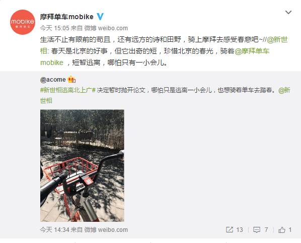 最近,摩拜联合“新世相”共同参与“逃离北上广”策划。活动当天,摩拜从中午12点开始点亮全国60万辆红包车,用户可以免费骑乘,“去公园、小路,任何一个春天里你想了很久的角落”。
